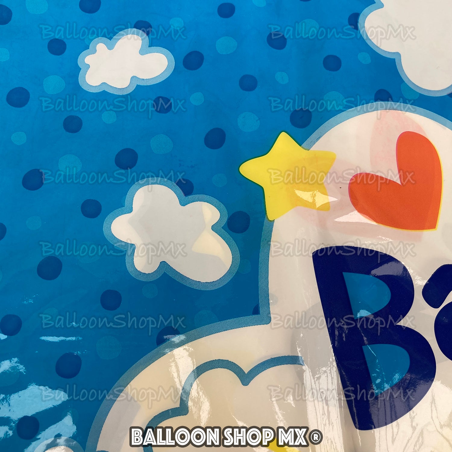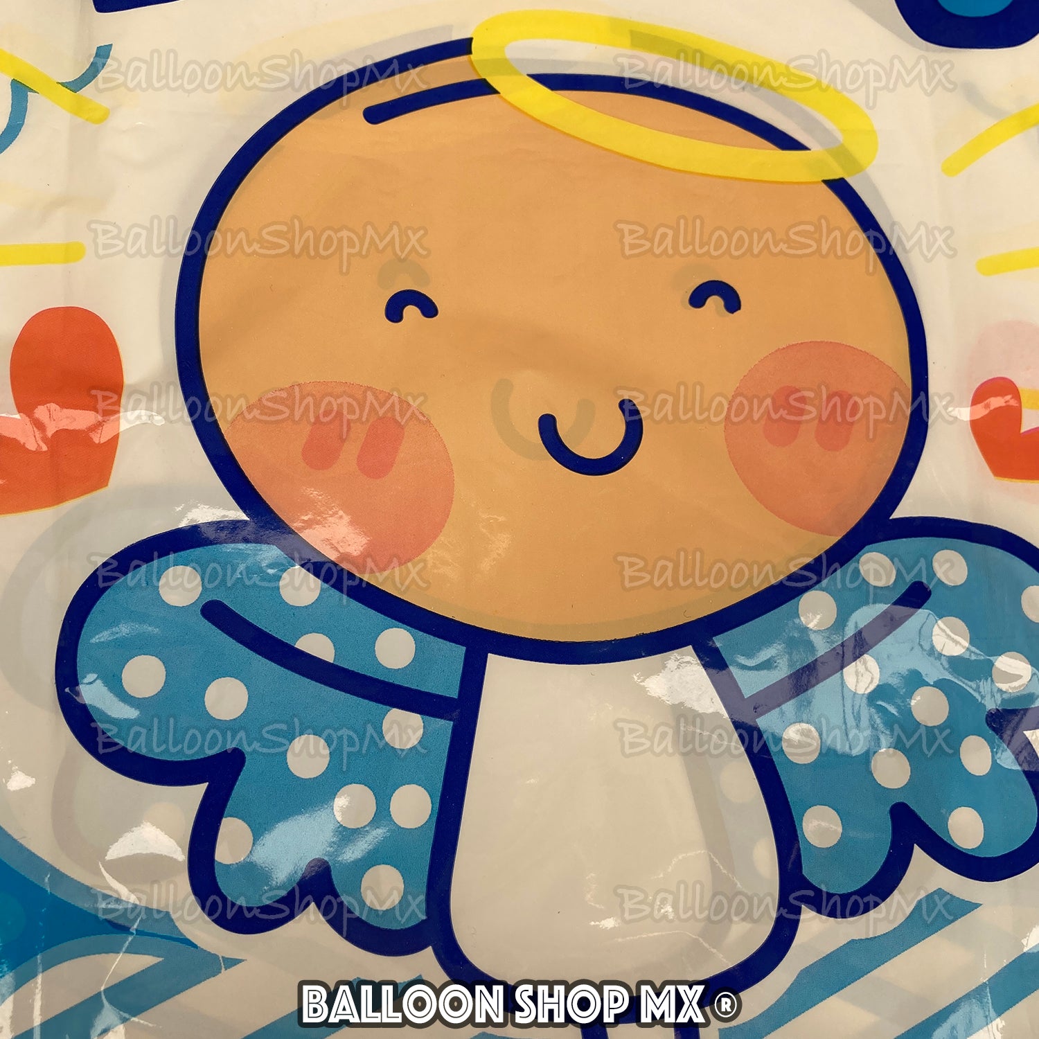 Globo en forma cuadrada color azul con decorado de un angelito y la frase "Mi Bautizo", ademas trae de relleno nubecitas, corazones y estrellas.