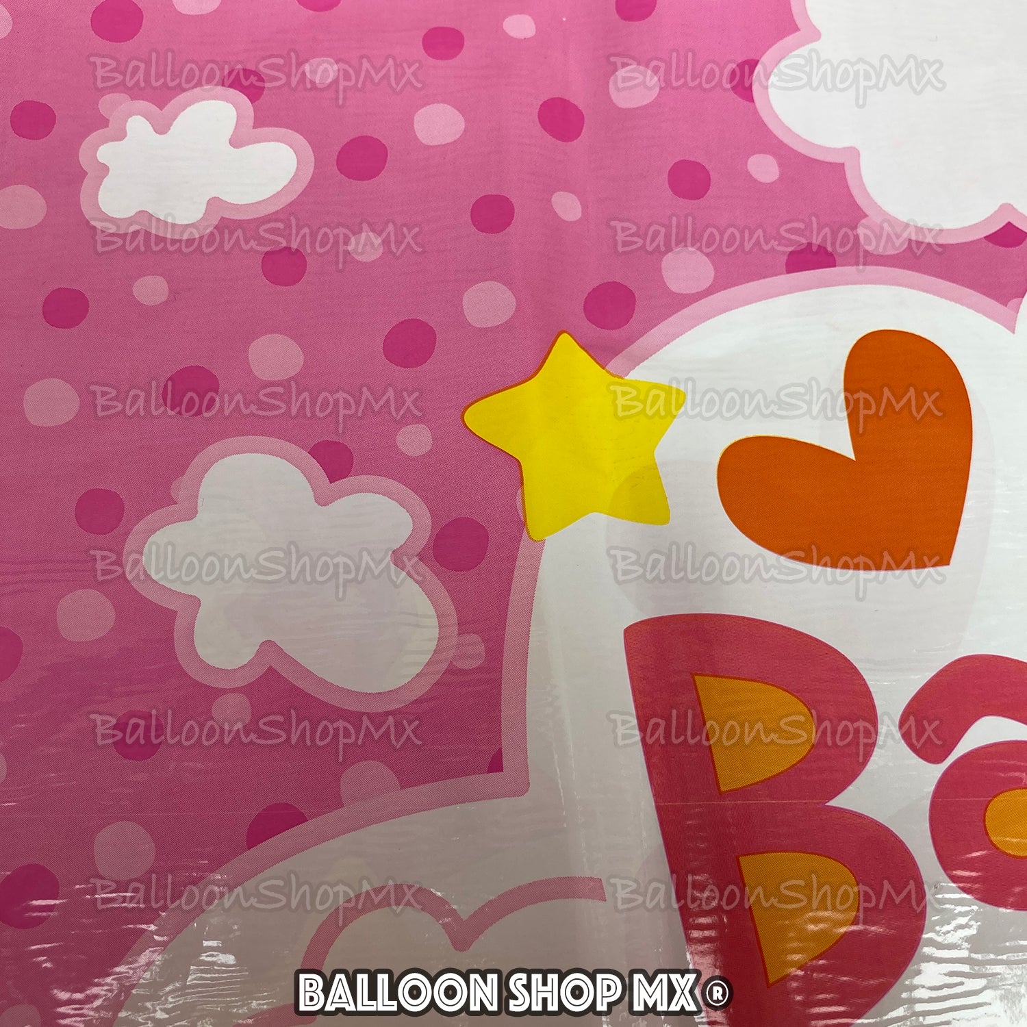 Globo en forma cuadrada color rosa con decorado de un angelito y la frase "Mi Bautizo", ademas trae de relleno nubecitas, corazones y estrellas.