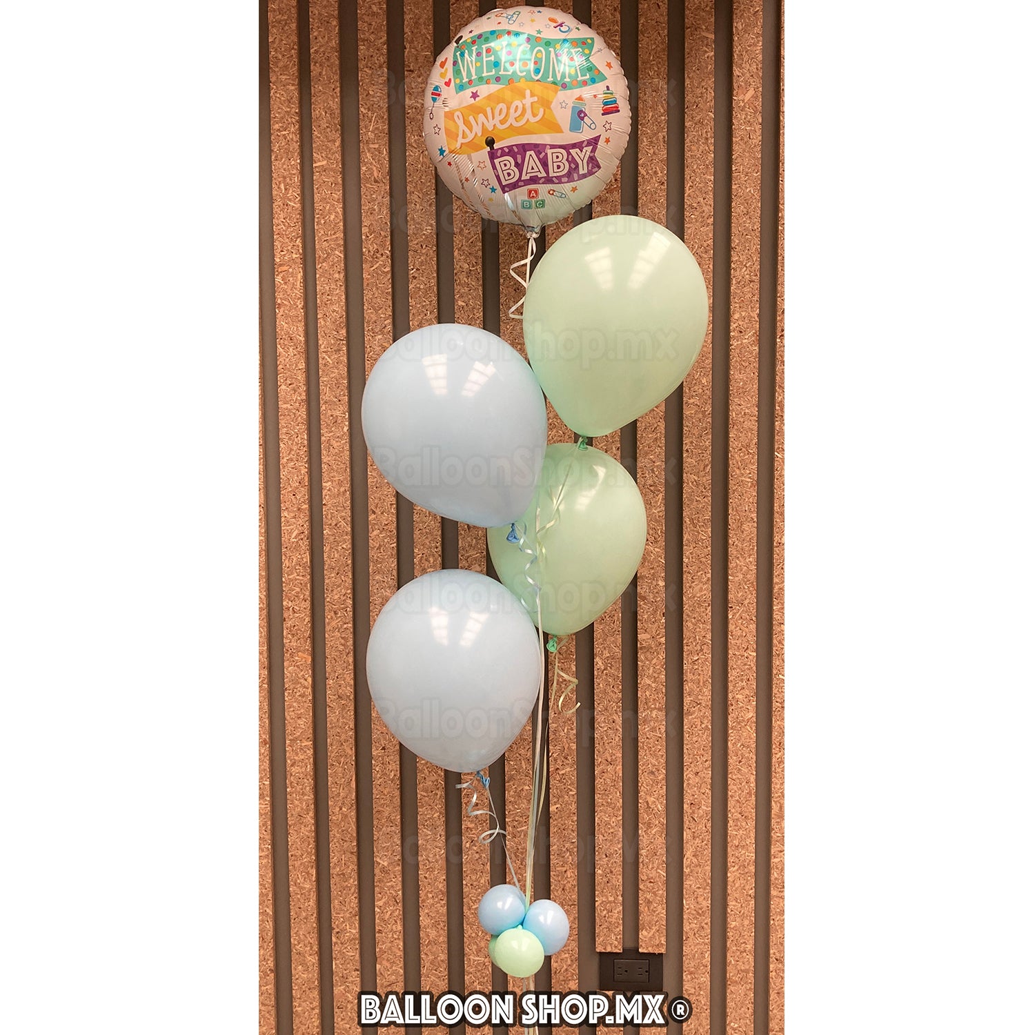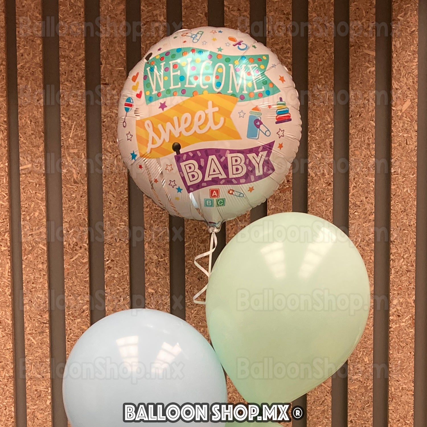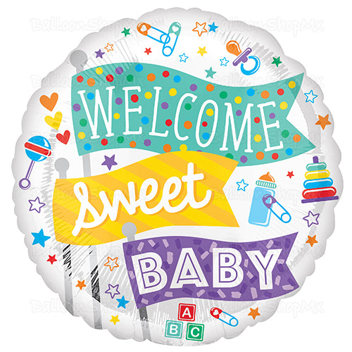 Globo redondo en color blanco nacarado decorado con 3 banderines de colores y la frase "Welcome Sweet Baby", el resto del globo viene decorado con estrellas, biberones, chupones, corazones, sonajas, etc.