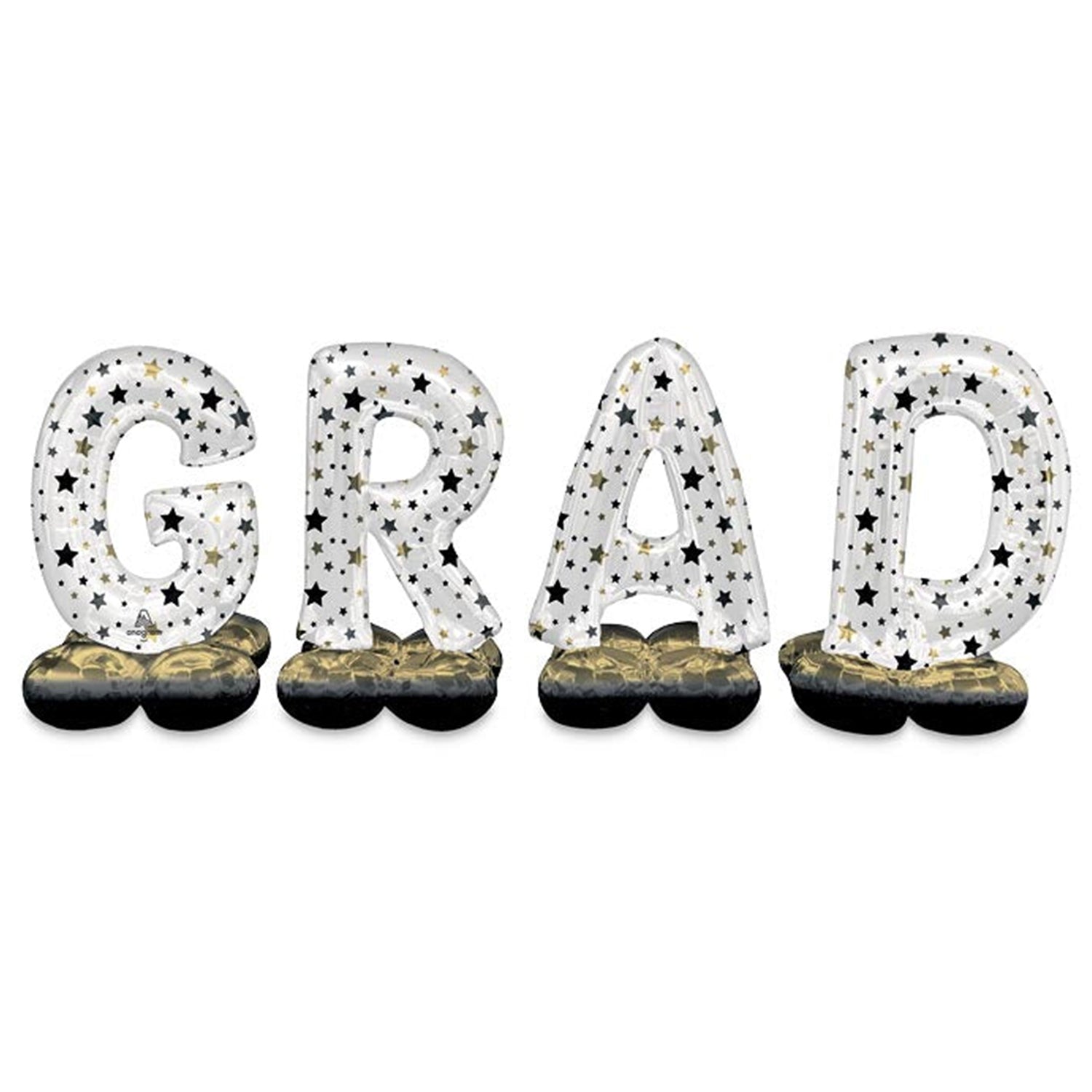 La frase GRAD formada por letras en tamaño jumbo. Cada letra viene de forma individual con base, las letras son de color blanco con estrellas doradas y negras y la base viene en color degradado de negro y dorado. Estas letras pueden ser usadas en interior o exterior, formando una decoración de casi 3 metros de ancho.