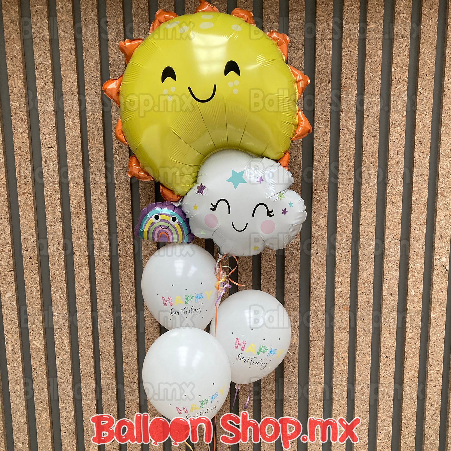 Globo con un sol gigante sonriente, una nubecita blanca con estrellitas también sonriendo y un arcoíris a un costado.