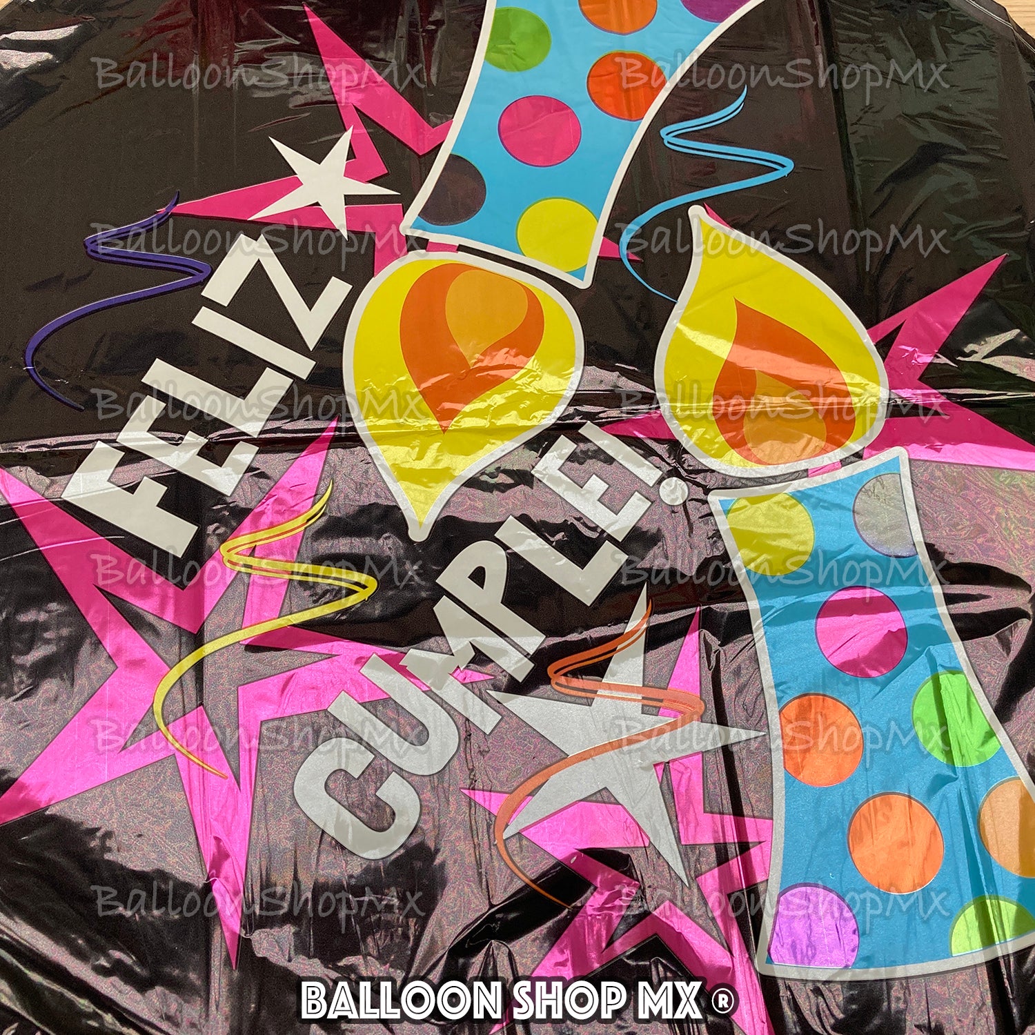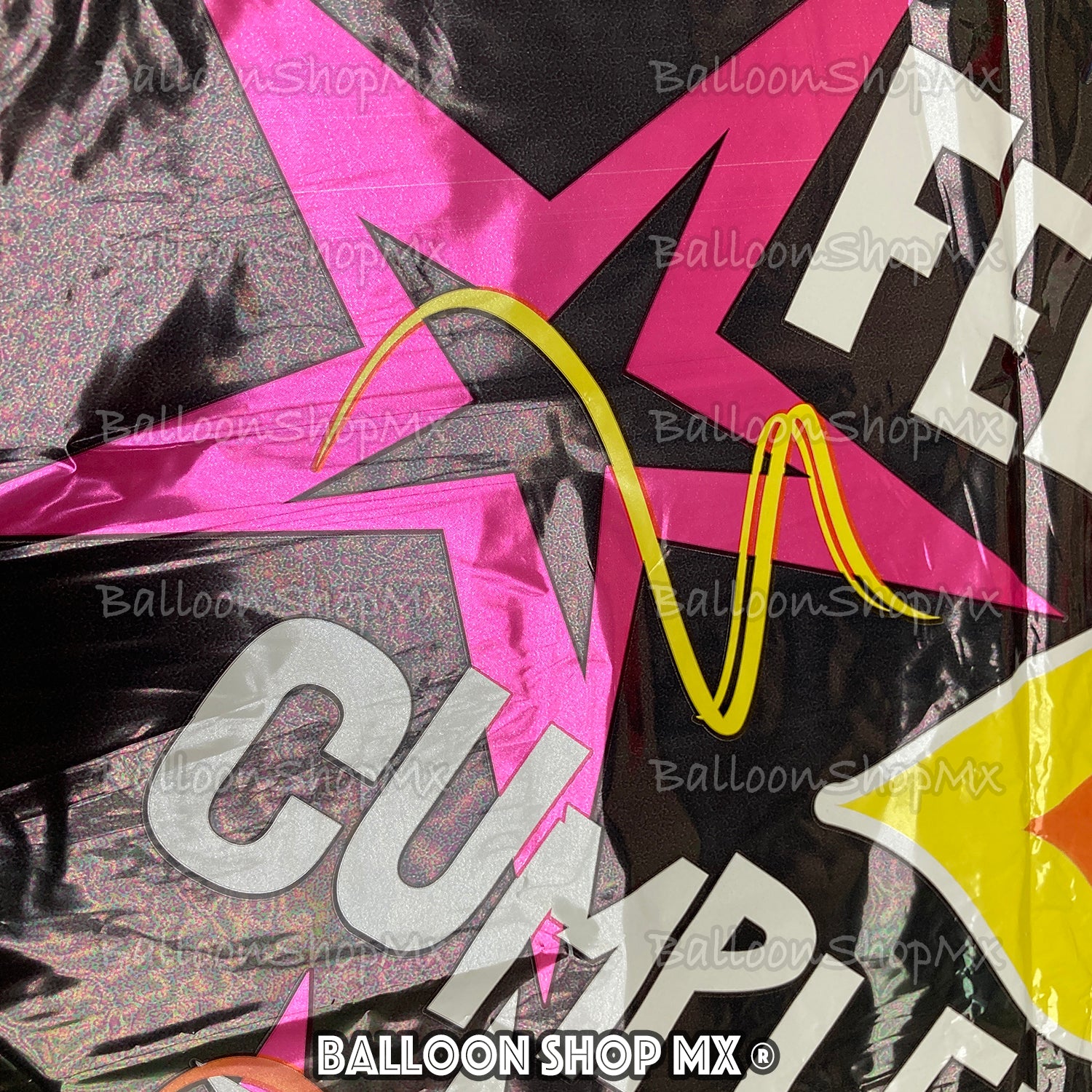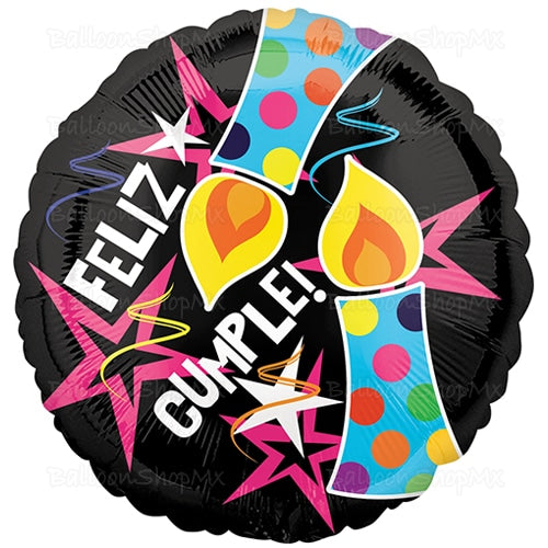 Este globo es muy llamativo, tiene el fondo en color negro y esta decorado con unas estrellas de color rosa, un par de velas de cumpleaños encendidas con confeti y la frase "Feliz Cumple!" en color blanco.