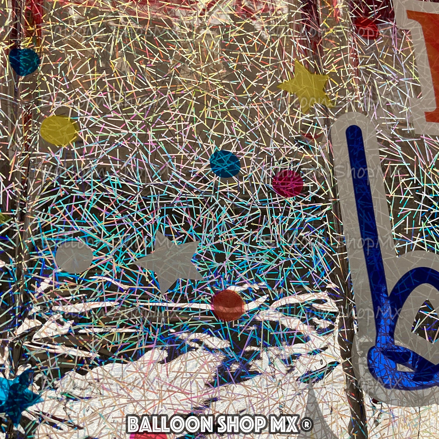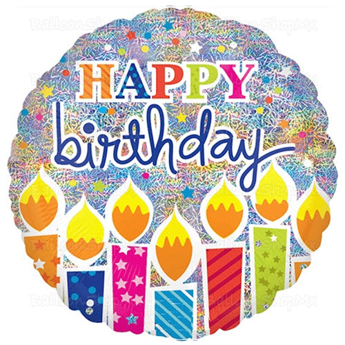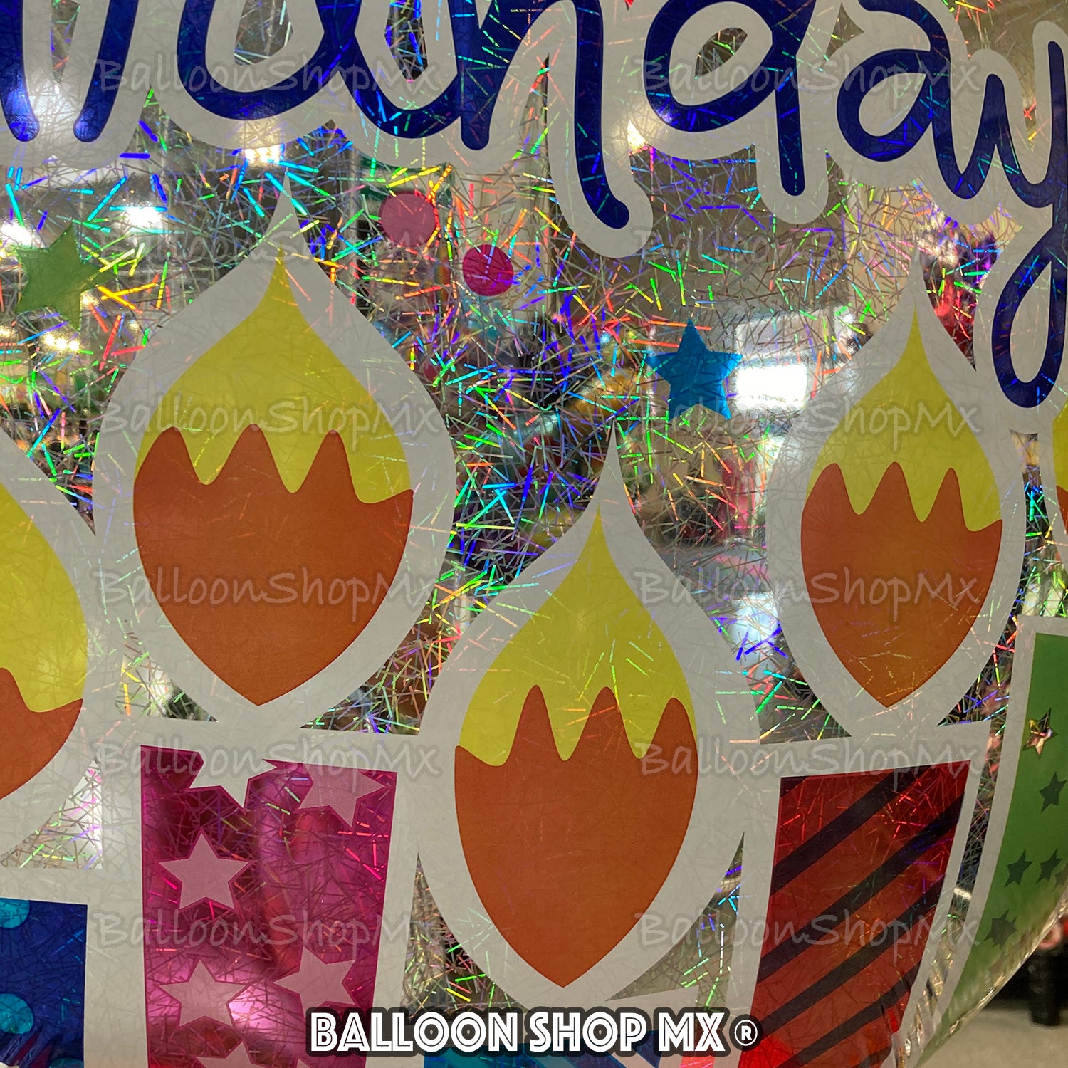 Este globo tiene un acabado espectacular, todo el globo trae detalles holográficos que con el movimiento y la luz generan destellos. La parte baja viene decorada con velas de cumpleaños encendidas y en la parte superior la frase "Happy Birthday" en doble tipografía y colores.
