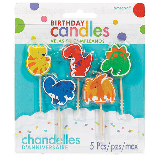Kit de 5 velitas de dinosaurios decoradas a todo color y con muchos detalles. Cada velita trae un palito para enterrarse en el pastel.