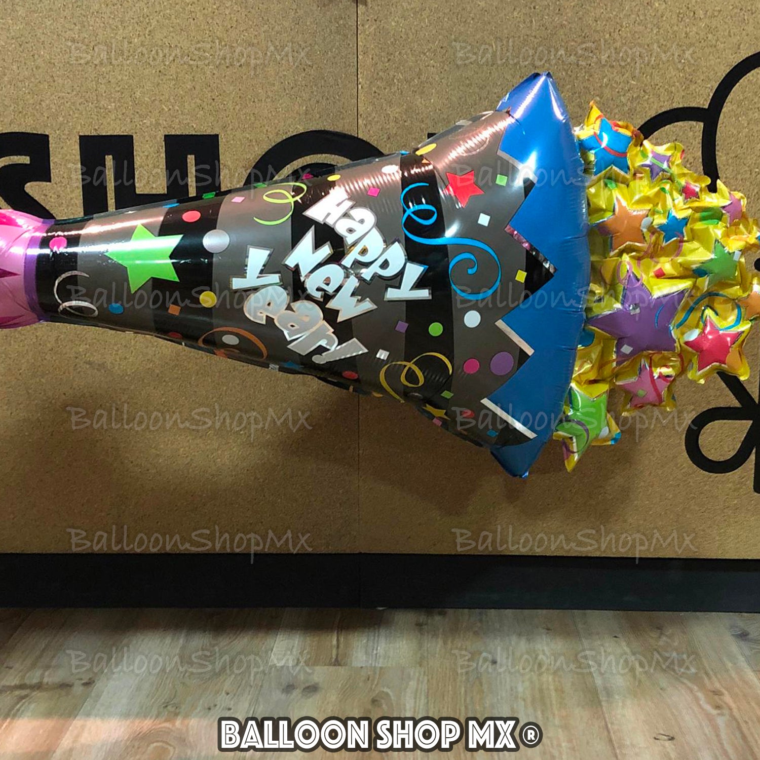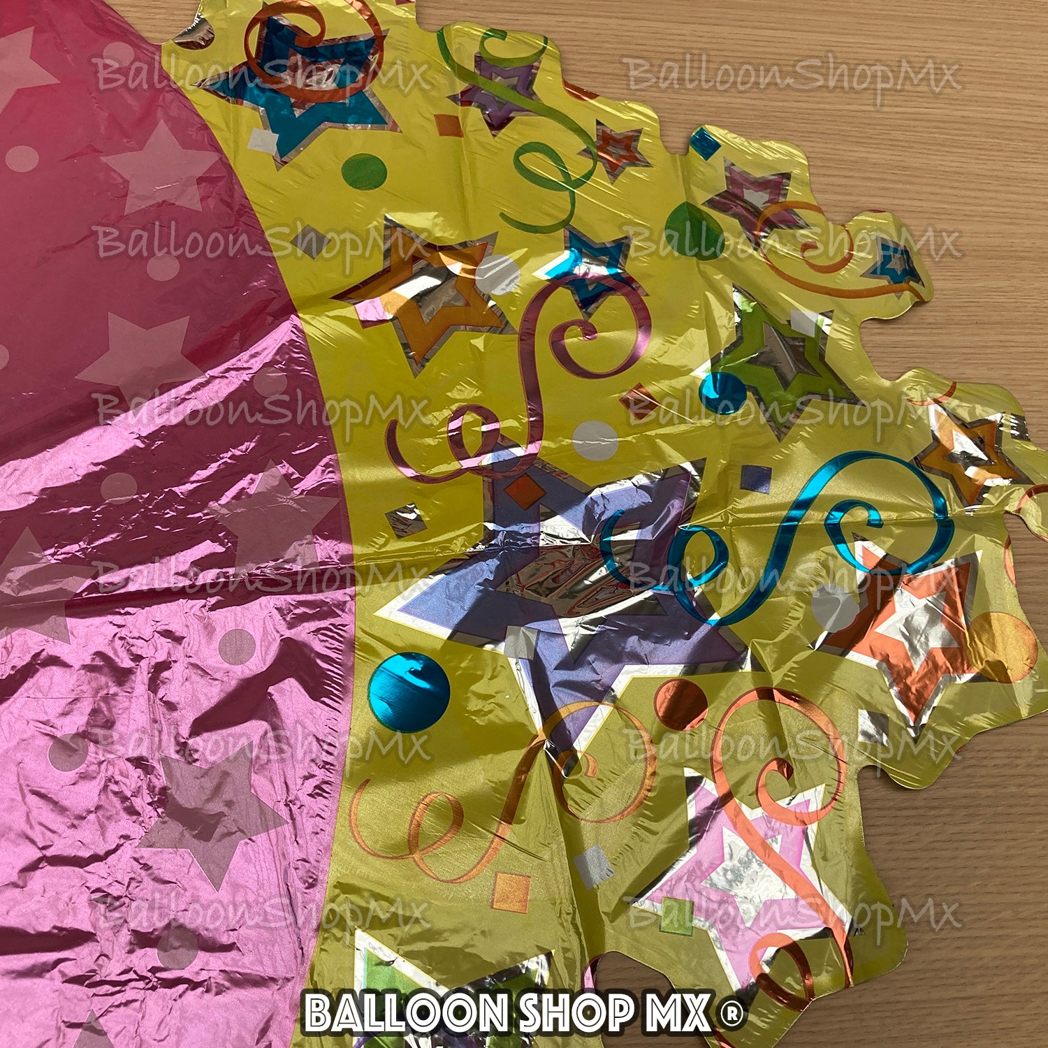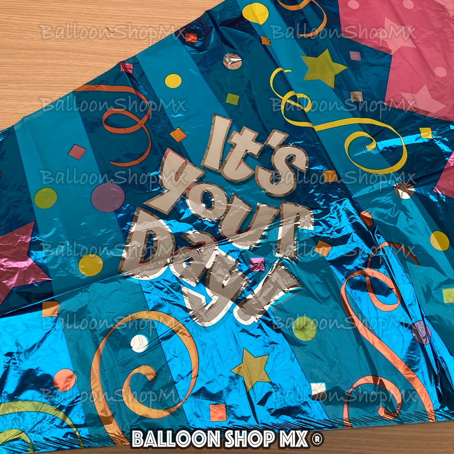 Globo con forma de vuvuzela, esta viene decorada en tonos azules y rojos y la frase al centro en color blanco "It's your day". Al extremo de la vuvuzela viene una explosión en dorado con multiples estrellas de colores con un efecto 3d.